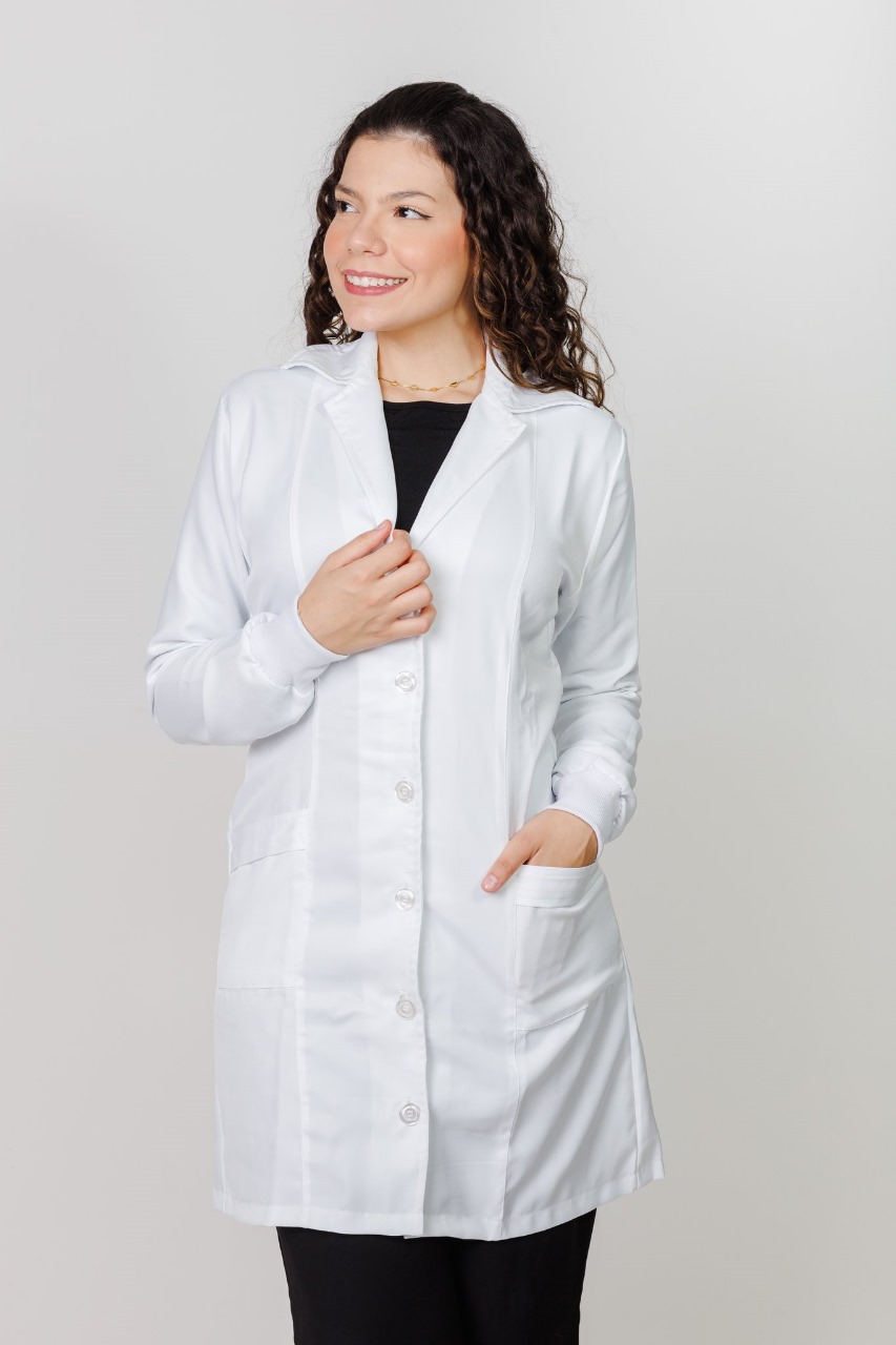 Confeccionado em tecido gabardine, é resistente, durável e possui excelente caimento. Apresenta gola lapela, fechamento frontal com botões transparentes, punhos com elástico embutido e dois bolsos frontais funcionais, ideais para o dia a dia na área da saúde, estética ou bem-estar.